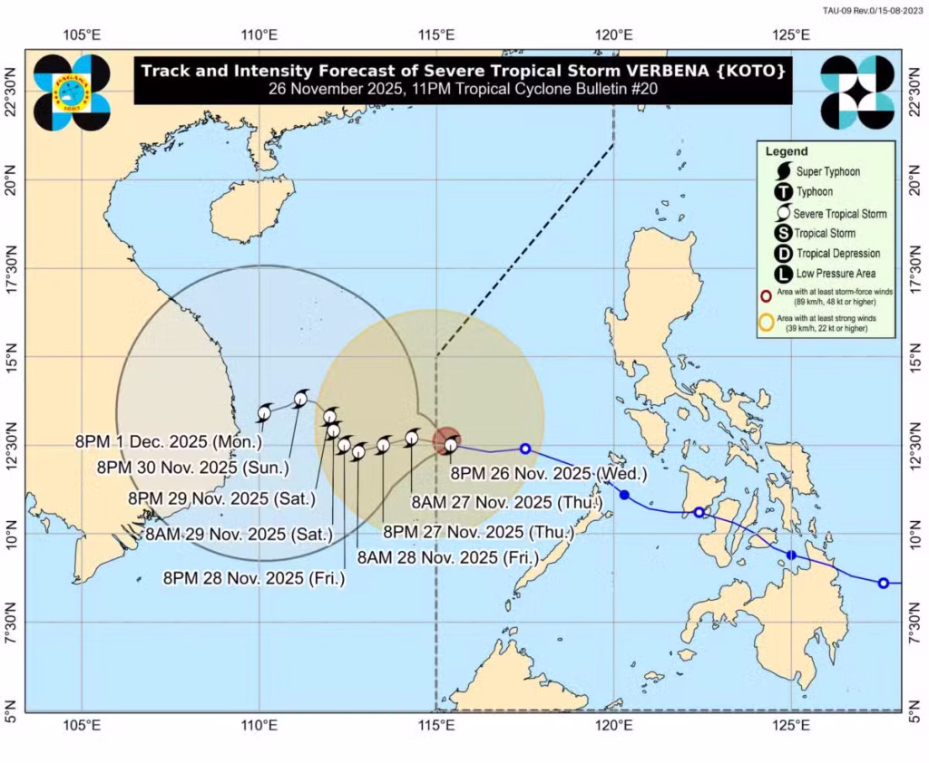 MANILA, Philippines — Severe Tropical Storm Verbena continues to move westward over the West Philippine Sea and is expected to…